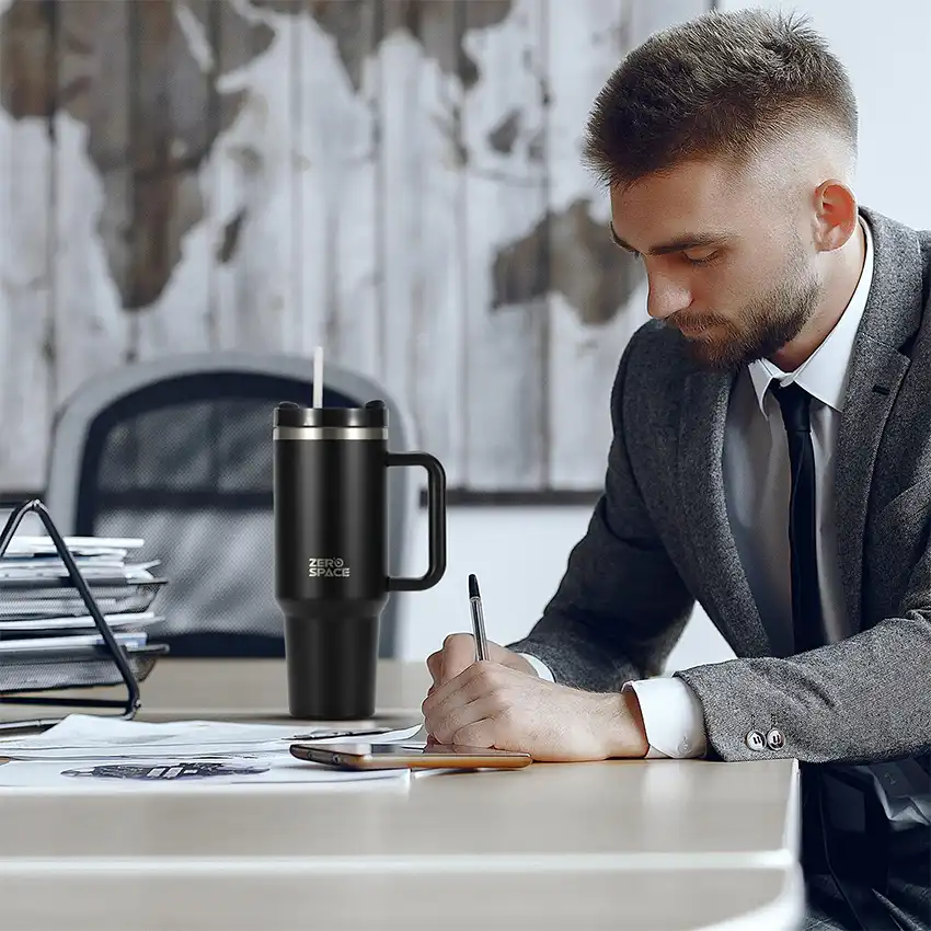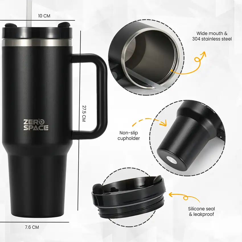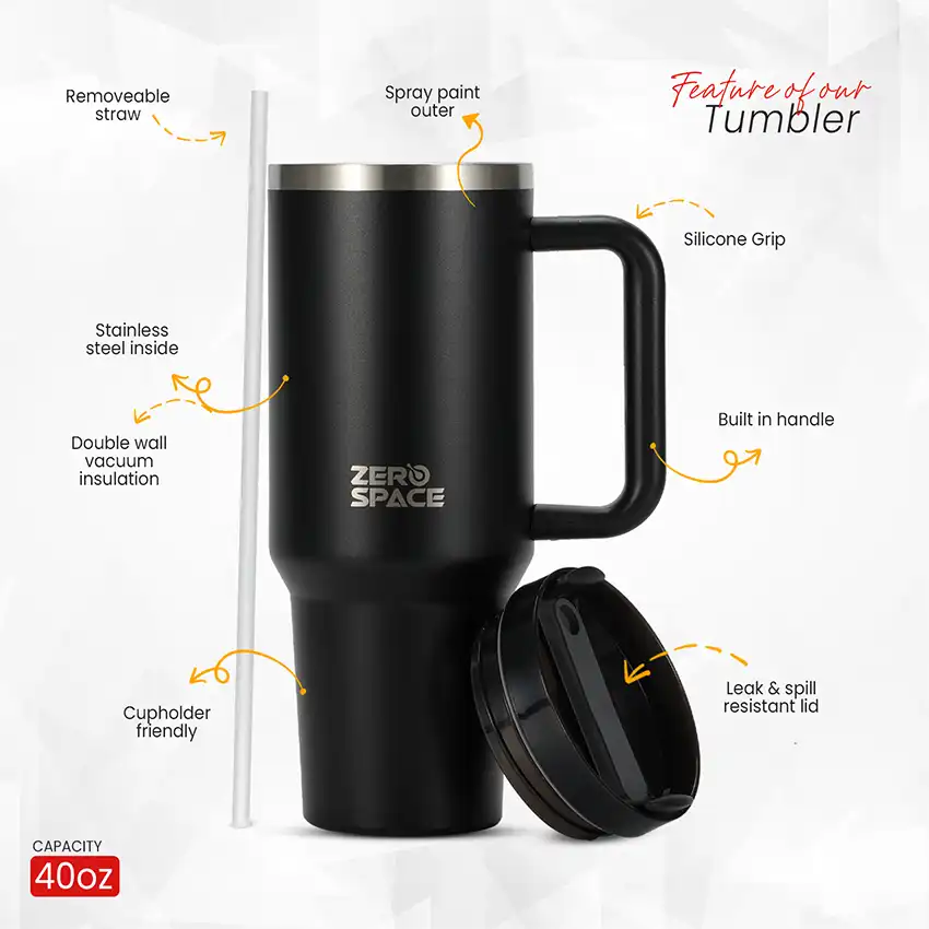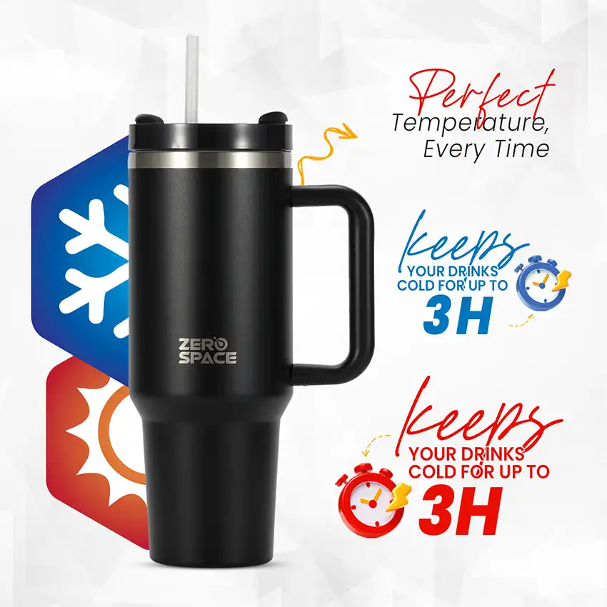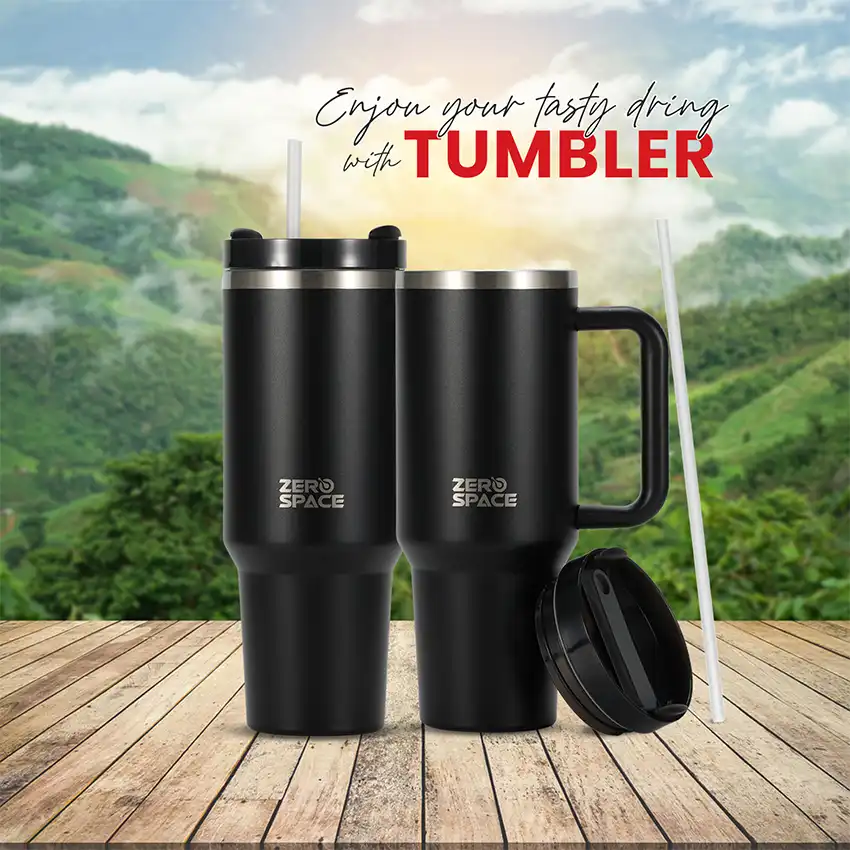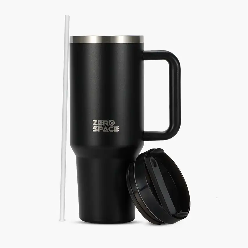 Meet your perfect all-day coffee companion — the ZeroSpace Black Tumbler. Built from pro-grade stainless steel with double-wall vacuum insulation, this black coffee tumbler keeps your drinks hot for 12 hours and cold for 24 hours. Sleek, durable, and leak-proof — designed for Pakistan’s active office workers, gym enthusiasts, and commuters.